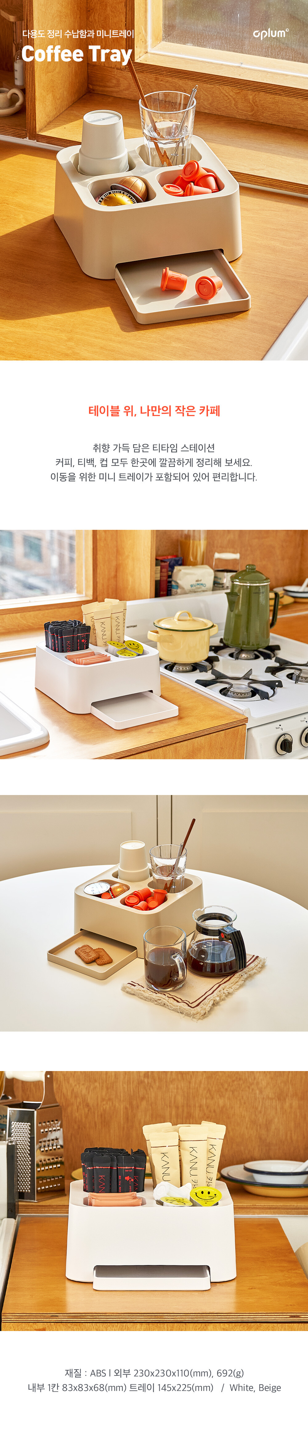 [커피, 티 정리함] 티타임의 필수품, 세련된 디자인의 커피 트레이는 각종 차 티백, 스틱 커피를 수납할 수 있는 본체와 미니 쟁반이 일체형으로 디자인되어 깔끔하고 편리한 수납을 도와줍니다.