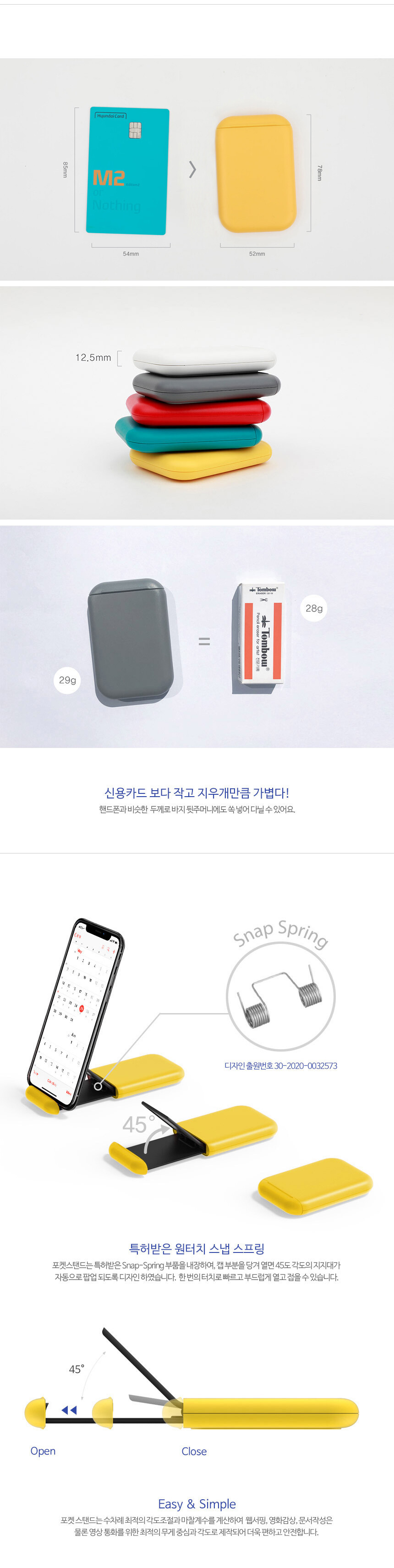 포켓스탠드는 주머니에 쏙 들어가는 작고 얇은 핸드폰 거치대 입니다. 뛰어난 휴대성과 손쉬운 사용으로 모바일 라이프를 더욱 편리하게 즐겨보세요.